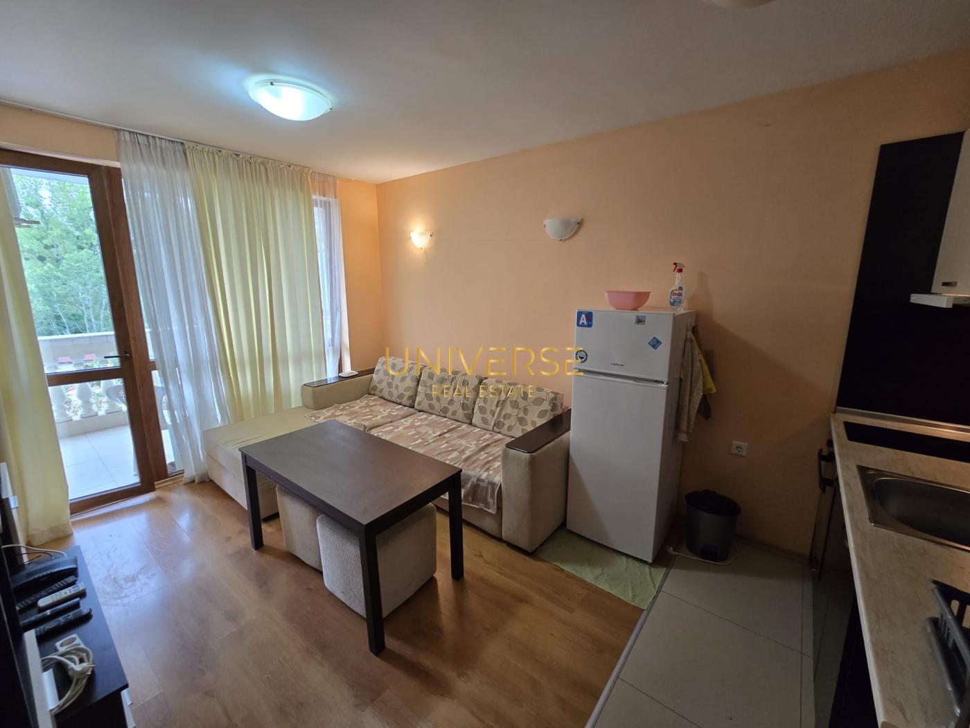 Продава се двустаен апартамент в премиум комплекс в Слънчев бряг. Намира се само на 800 метра от плажа. Апартаментът се състои от входно антре, уютна всекидневна с кухненски бокс и трапезария, една спалня, баня с душ и тераса. Апартаментът е обзаведен дизайнерски и оборудван с всички необходими уреди и спално бельо, което го прави готов за комфортно обитаване. Богати градски удобства се намират само на метри от комплекса. Удобствата на комплекса включват: басейн с детски кът; паркинг; зона за барбекю; частен малък парк; детска площадка; зона за отдих; видеонаблюдение и 24-часова охрана. Акт 16 #5078