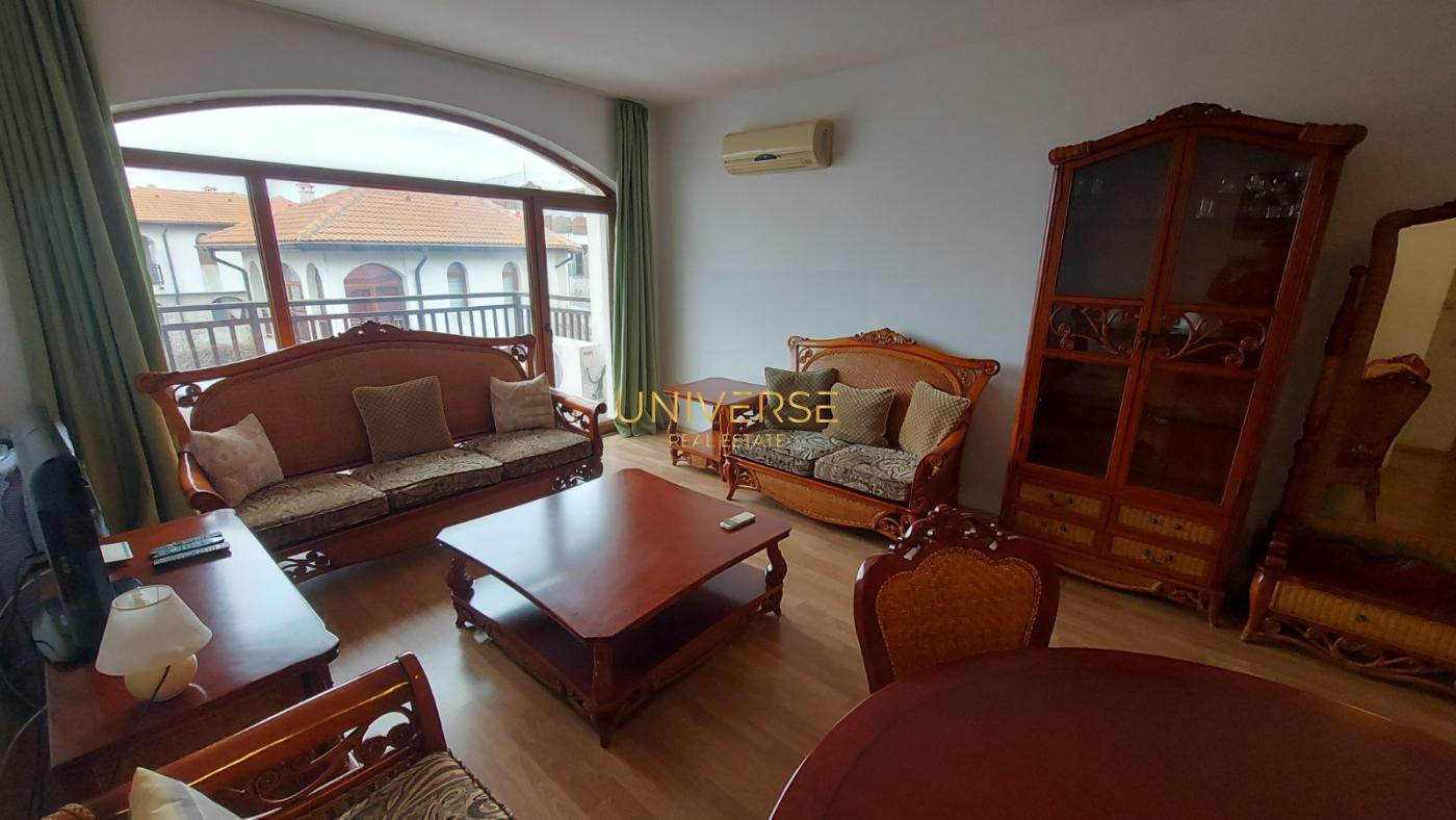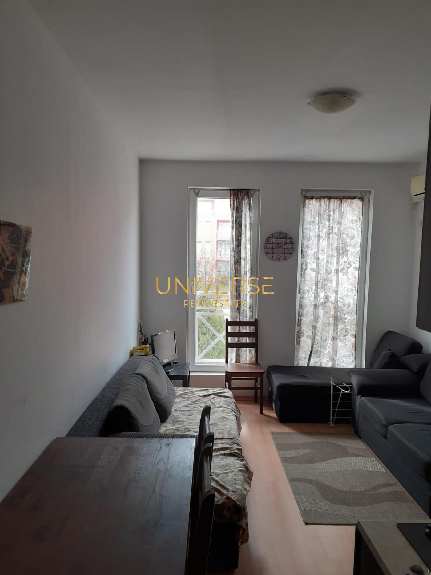 Продава се апартамент 1+1 в луксозен комплекс в Слънчев бряг. Срещу комплекса има парк. Състои се от трапезария с кухненски бокс, спалня, коридор, баня и балкон. Апартаментът е реновиран по европейски стандарти и е обзаведен с висококачествени мебели и модерни уреди. Комплексът предлага следните удобства: огромен зелен парк с беседки и пешеходни алеи, лоби/рецепция, Chill Out бар, фитнес център на открито, волейболно игрище, джакузи на открито, пералня, безплатен Wi-Fi/интернет, телевизор с над 200 канала, домофони, пожароизвестителна система, 24-часова охрана и видеонаблюдение. Морето е на 500-600 метра. Стара планина е на 5 минути пеша. Голям целогодишен супермаркет е на 100 метра. Цялата необходима инфраструктура е на пешеходно разстояние. Акт 16. № 5463