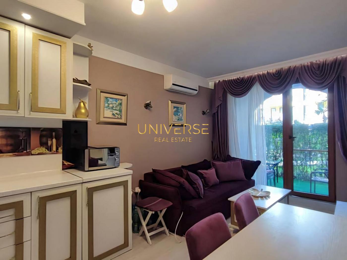 Продава се апартамент 1+1 в премиум комплекс в Слънчев бряг. Намира се само на 800 метра от плажа. Апартаментът се състои от входно антре, уютна всекидневна с кухненски бокс и трапезария, една спалня, баня с душ и тераса. Апартаментът е обзаведен дизайнерски, оборудван с всички необходими уреди и спално бельо и е готов за комфортно обитаване. Богата градска инфраструктура се намира само на метри от комплекса. Удобствата на комплекса включват: басейн с детски кът; паркинг; зона за барбекю; частен малък парк; детска площадка; зона за отдих; видеонаблюдение и 24-часова охрана. Акт 16.#5418