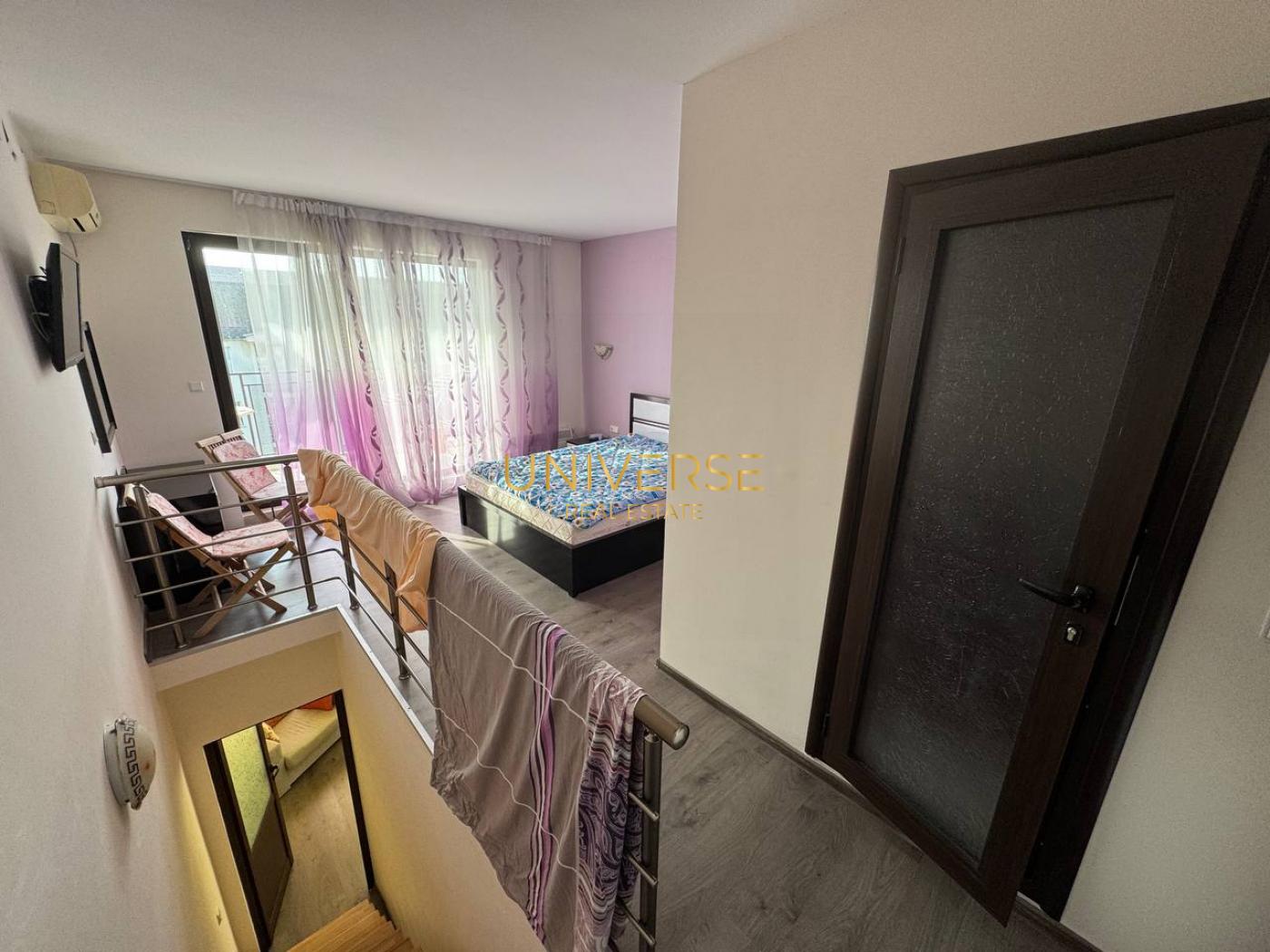Продава се мезонет 1+1 в целогодишен комплекс в Слънчев бряг. Топ локация: централно, близо до всички целогодишни удобства, комплексът се намира в тиха част на курорта. Състои се от кухня/трапезария, спалня, баня с душ и тераса. Затвореният комплекс разполага с басейн, асансьор и беседка. Територията е озеленена и благоустроена. Само на 10 минути от плажа. Акт 16. Такса поддръжка: 10 лв./м² с интернет. #5275