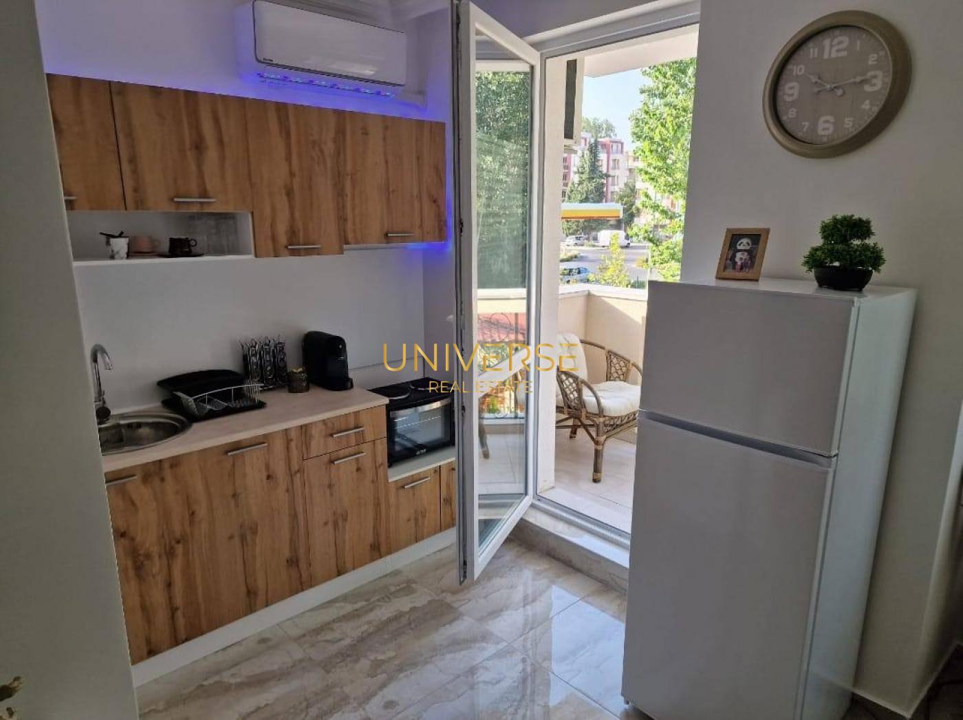 Предлагаме за продажба студио в нов жилищен комплекс, разположен в централната част на Слънчев бряг, на 700 метра от морето. Студиото е наскоро реновирано, обзаведено и оборудвано. В непосредствена близост се намират супермаркет, магазини, аптека, кафенета, ресторанти, снек-бар, пазари за плодове и зеленчуци, както и обществен транспорт. Инфраструктурата и удобствата в комплекса включват: басейн; охрана; паркинг; и детска площадка. Сградата е подходяща за сезонно и целогодишно ползване. Акт 16.#5374