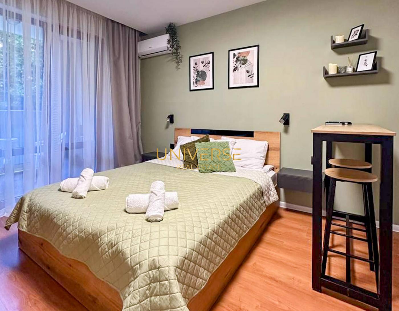 Уютно студио на брега на морето в Свети Влас! Апартаментът е напълно обзаведен и оборудван. Комплексът се намира в зелена зона, далеч от оживения квартал Юрта. В близост има тенис кортове, фитнес зали, басейни, магазини и ресторанти. Акт 16. #5290