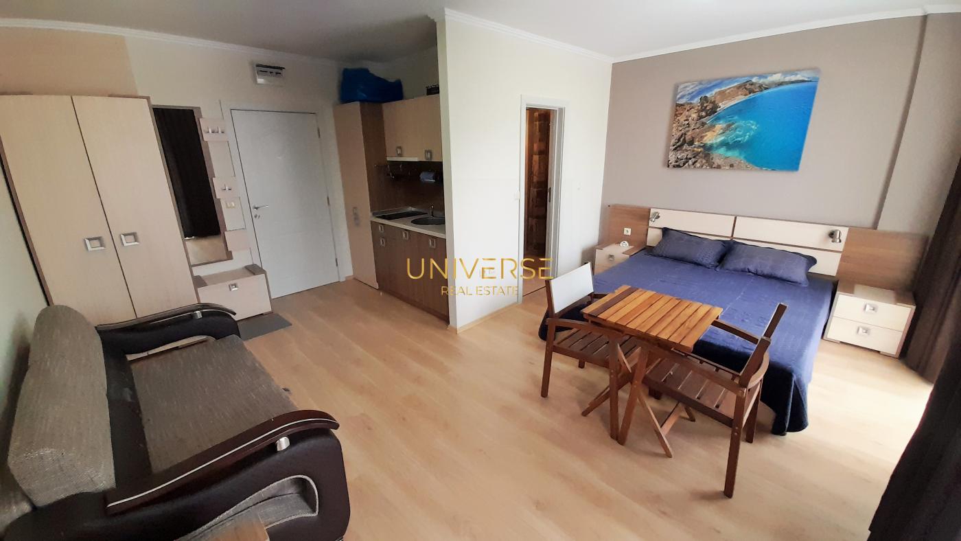 A studio apartment in Sunny Beach is available for purchase. It is fully furnished and equipped. Layout: living room with kitchenette, combined bathroom, large terrace. Excellent rental potential. Complex amenities and infrastructure: year-round maintenance; beautifully landscaped areas; parking; video surveillance and security; swimming pool; and cafe. The sea is 600 meters away. All year-round amenities are within walking distance. Act 16. #5712