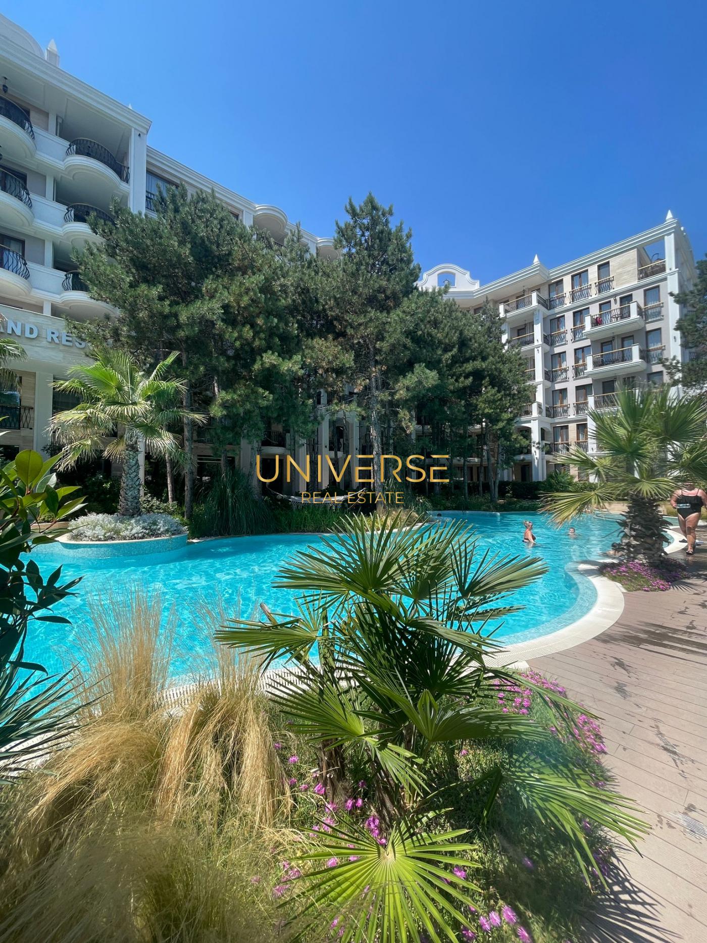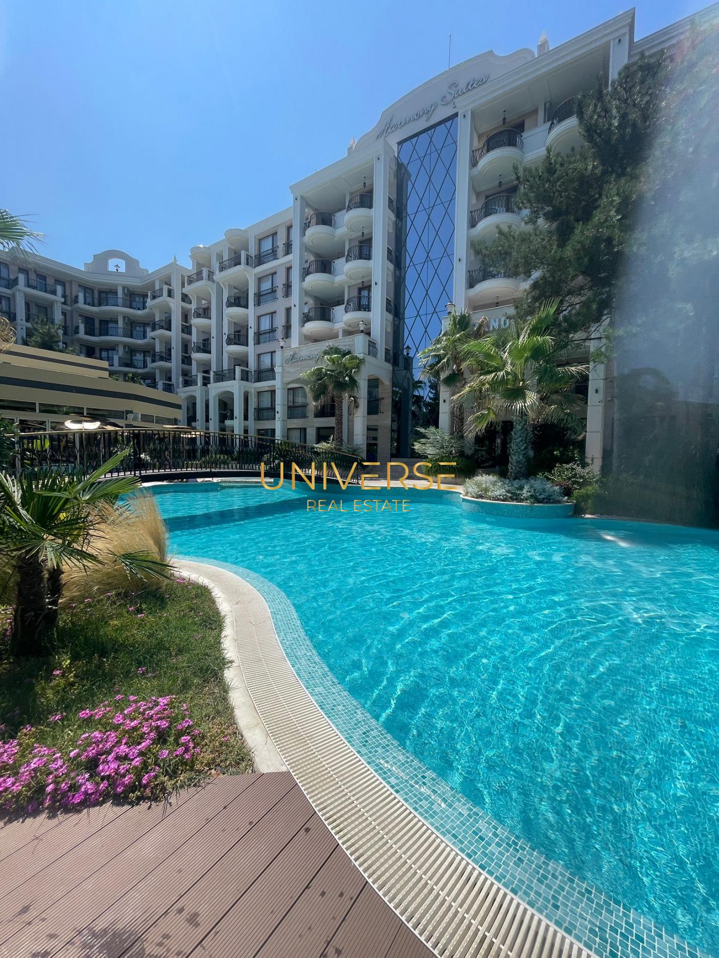 Eine 2+1-Zimmer-Wohnung in einer exklusiven Anlage in Sunny Beach steht zum Verkauf. Sie wird komplett möbliert und mit hochwertigen Haushaltsgeräten angeboten. Die luxuriöse Anlage liegt nur 800 Meter vom Strand entfernt und bietet einen Swimmingpool, einen Kinderspielplatz, eine Bar mit Restaurant, Sicherheitspersonal und Parkplätze. Akt 16 Nr. 5739