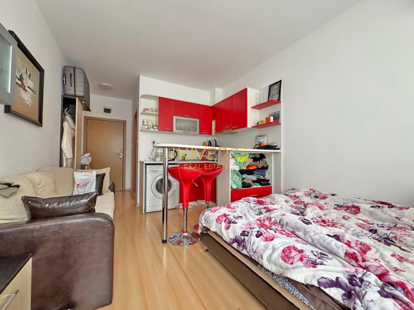 Wir bieten eine 1+1-Wohnung in einem Neubaukomplex in Sunny Beach zum Verkauf an. Die Wohnung besteht aus einem Wohn-/Essbereich mit Küche, einem Schlafzimmer, einem Badezimmer und einem Balkon. Sie ist frisch renoviert und mit neuen Möbeln, Haushaltsgeräten, Fußbodenheizung im Badezimmer, beheizten Handtuchhaltern und gefliesten Fluren ausgestattet. Der Komplex verfügt über mehrere Swimmingpools, darunter ein Meerwasserpool. Ein Zugangssystem mit Chipkarte ermöglicht den Zutritt zum gesamten Komplex. Ein kleiner Park mit Spielplatz ist ebenfalls vorhanden. Die Lage ist hervorragend, alles ist fußläufig erreichbar. #5515