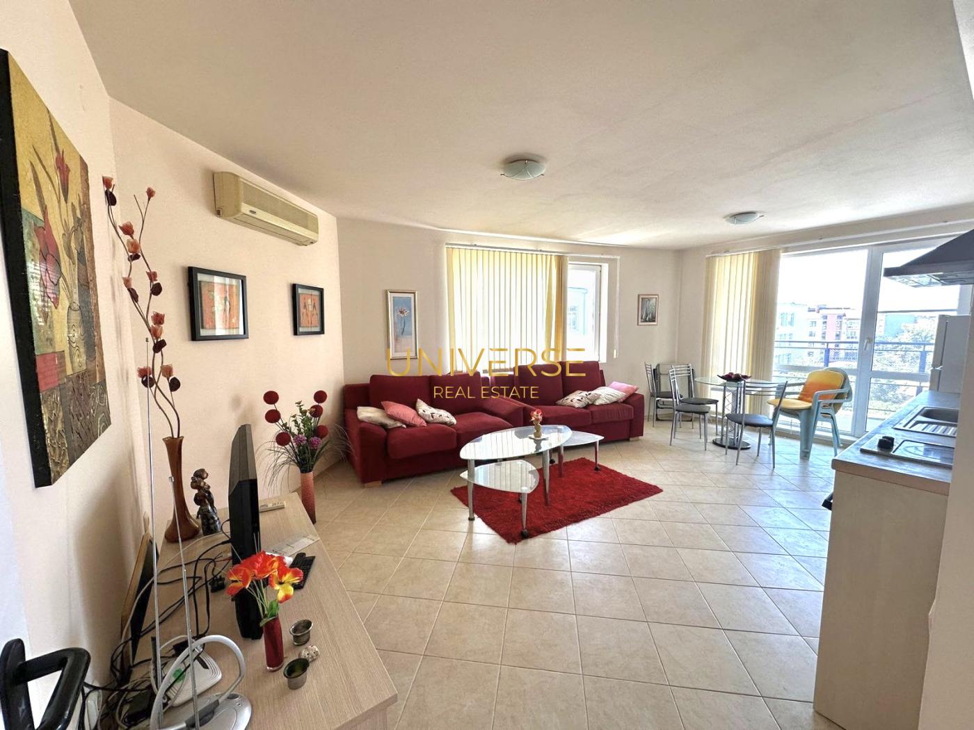 Eine 2+1-Zimmer-Wohnung in einem Neubau im Zentrum von Sonnenstrand steht zum Verkauf. Die Wohnung wird komplett möbliert und ausgestattet übergeben und verfügt über ein voll ausgestattetes Badezimmer. Die Anlage bietet modernen Komfort, Sicherheit und eine hervorragende Infrastruktur: eine geschlossene Wohnanlage mit Swimmingpool, Parkplatz und 24-