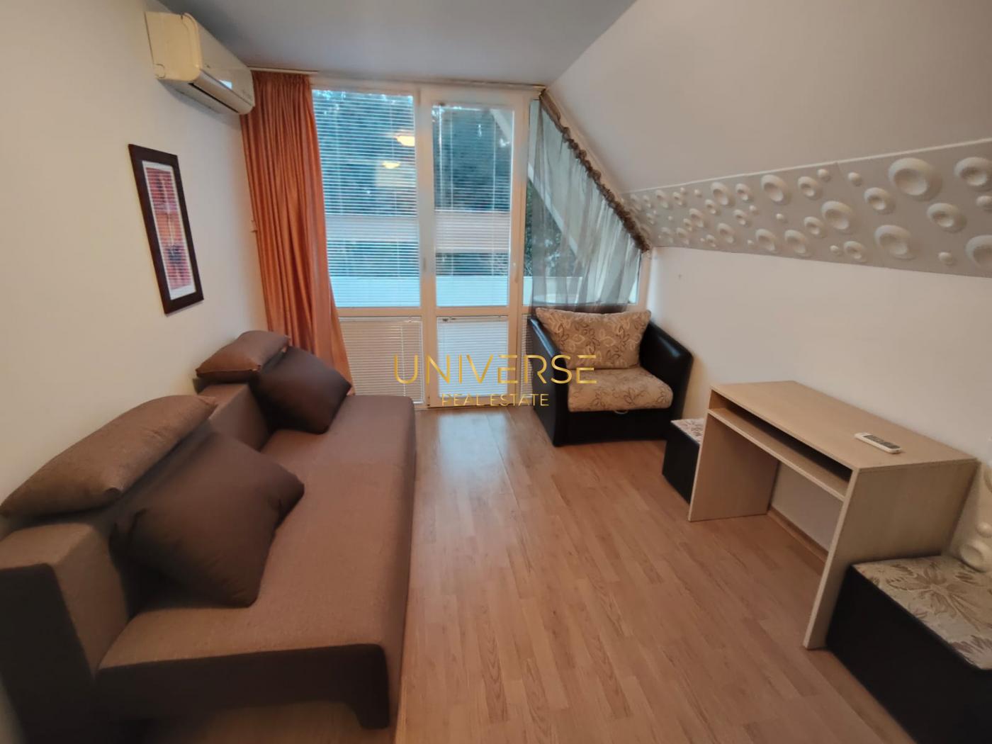 We offer a studio apartment for sale in a year-round complex in Sunny Beach. The kitchen and wardrobe are the only furniture left. The complex has a swimming pool and equipped recreation areas. A profitable investment opportunity for renting out. Household rates are included. Low maintenance fee of €35/year. All necessary amenities for comfortable living are located nearby. Act 16.#5454