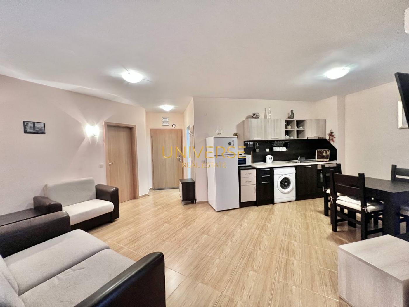 We offer a 1+1 apartment in a year-round complex in Sunny Beach. It consists of a kitchen/dining room, bedroom, and terrace. The apartment is fully furnished and equipped. It is ideal for both permanent residence and rental. Top location, in the Chaika neighborhood, with all amenities nearby. The complex features a large swimming pool, playground, and recreation areas. It is surrounded by a private garden. The sea is a 7-10-minute walk away. Maintenance fee: 8 euros/m². Act 16. #5423