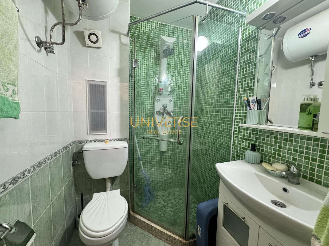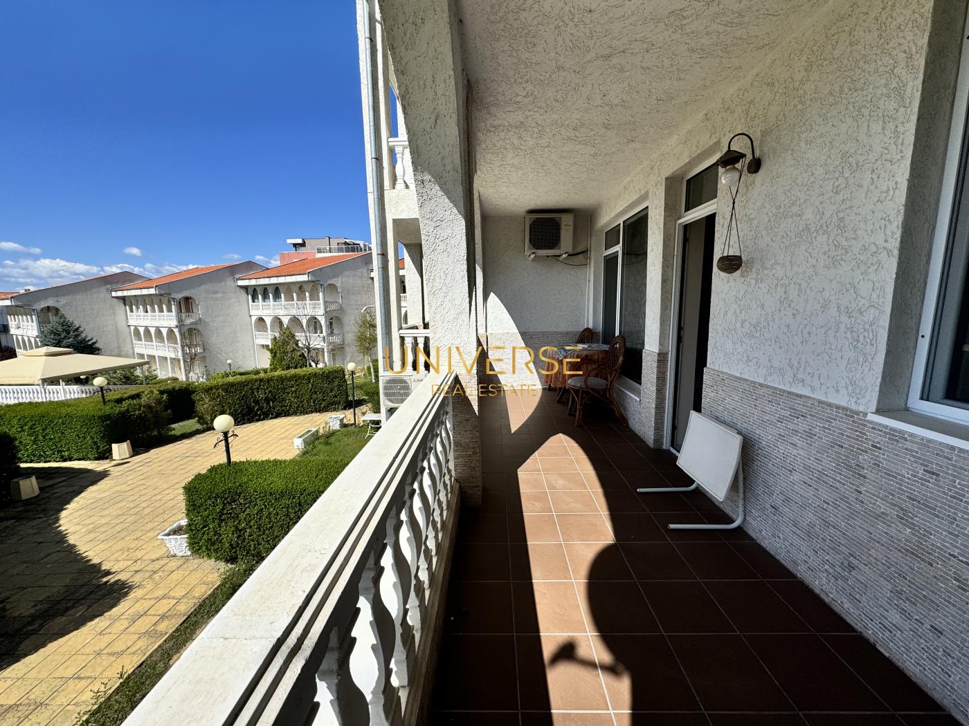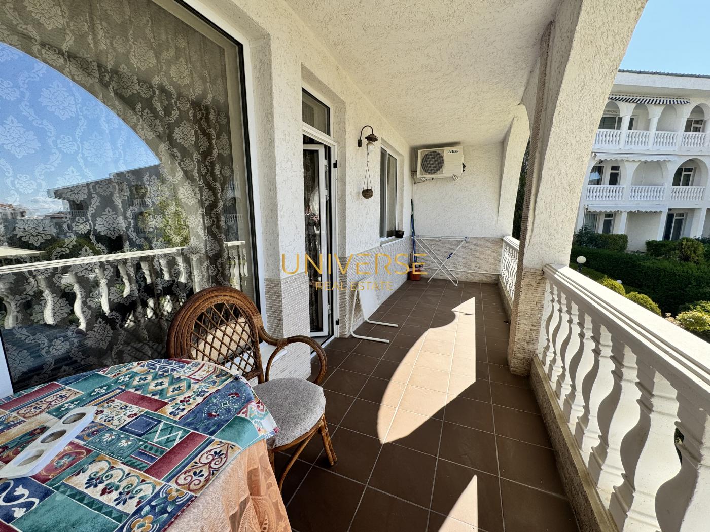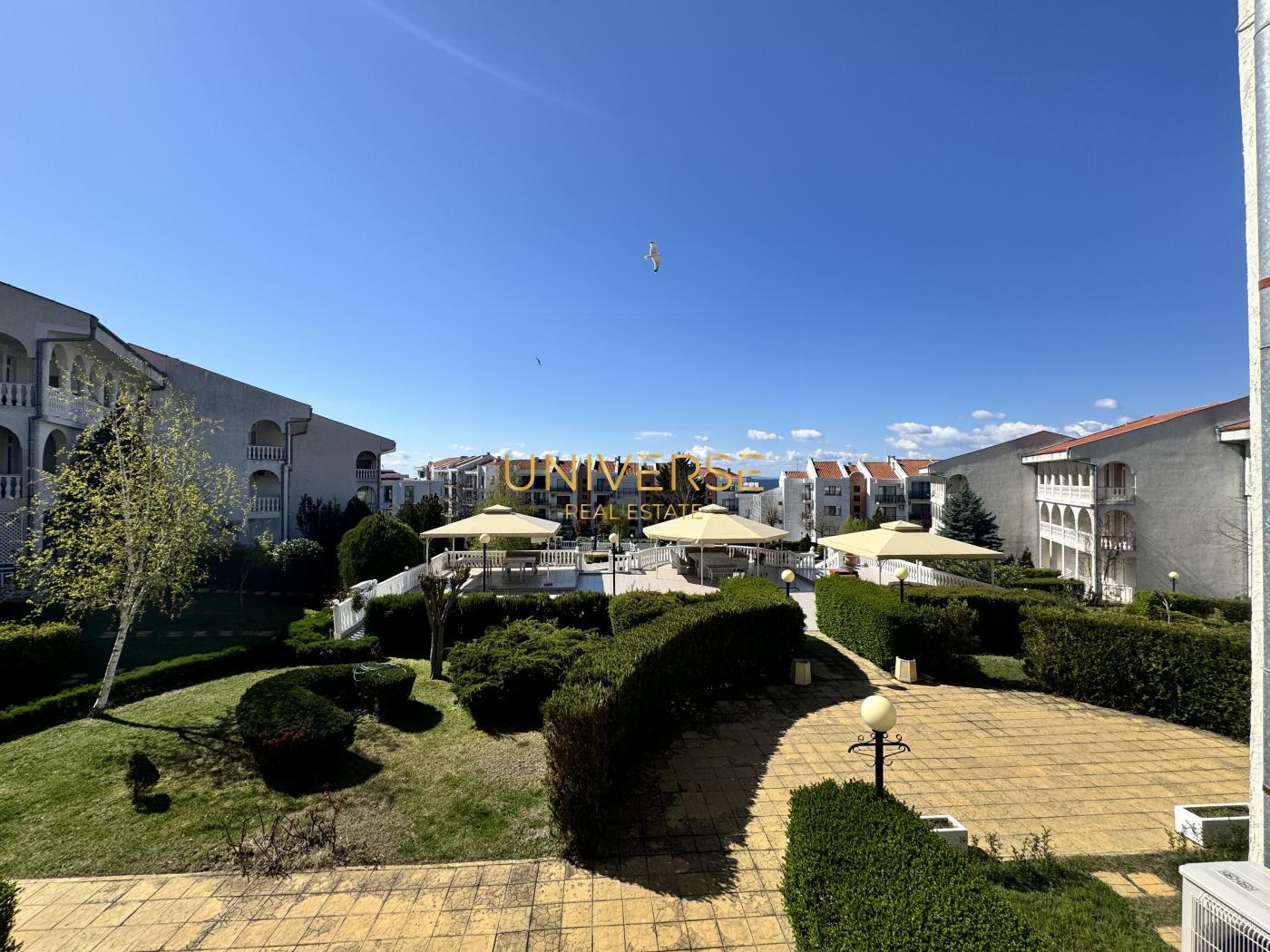 A two-bedroom apartment in Sveti Vlas is for sale. It is located near the Marina Dinevi yacht port. The apartment consists of an entrance hall, a living room with a kitchen/dining area, a bedroom, a bathroom with a shower, and a terrace overlooking the well-maintained grounds of the complex. The apartment is fully furnished and equipped. The complex offers the following amenities to owners and guests: a swimming pool, a summer garden, a café, shops, a playground, parking, and 24-hour security. The sea is only 200 meters away. Act 16.#5780