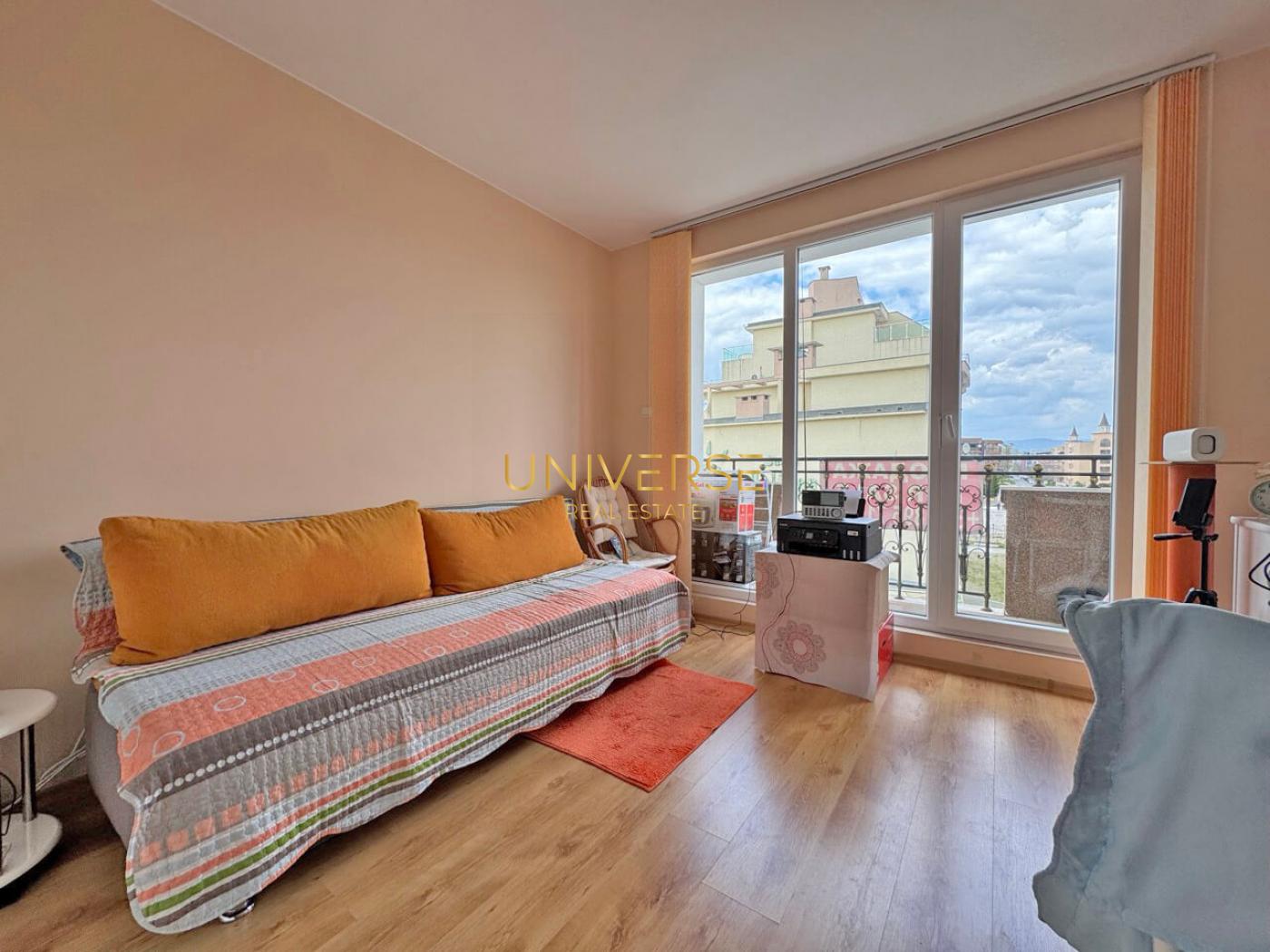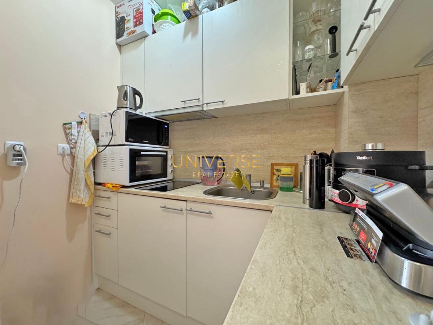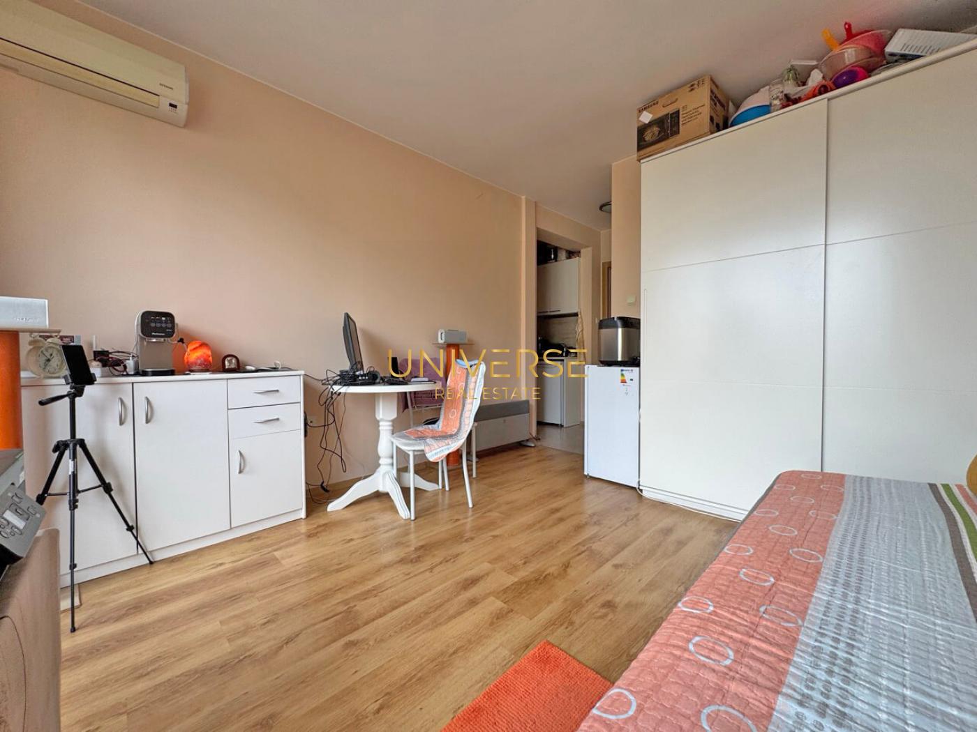 A studio apartment in a luxury complex in Sunny Beach is for sale. The apartment is fully furnished and equipped. This prestigious complex features a large swimming pool, relaxation areas, and sun loungers. The grounds include a children's playground, a sports area, and beautiful greenery with pine trees and palms. The property is gated and guarded for your comfort. The sandy beach is 500 meters away. Nessebar's amenities are within walking distance. Act 16.#5800