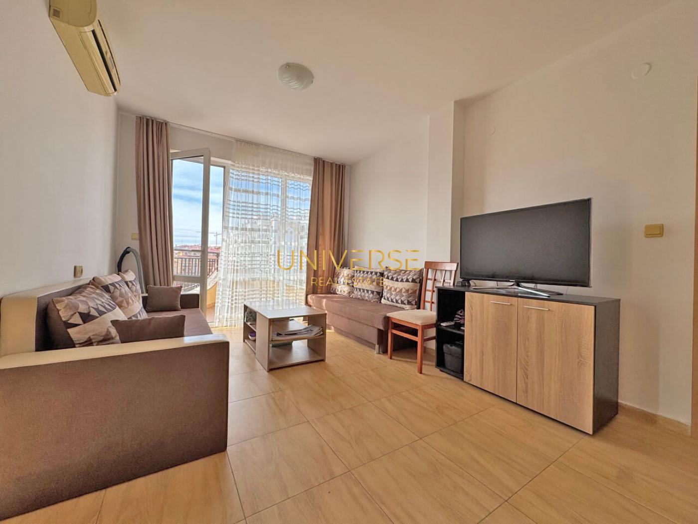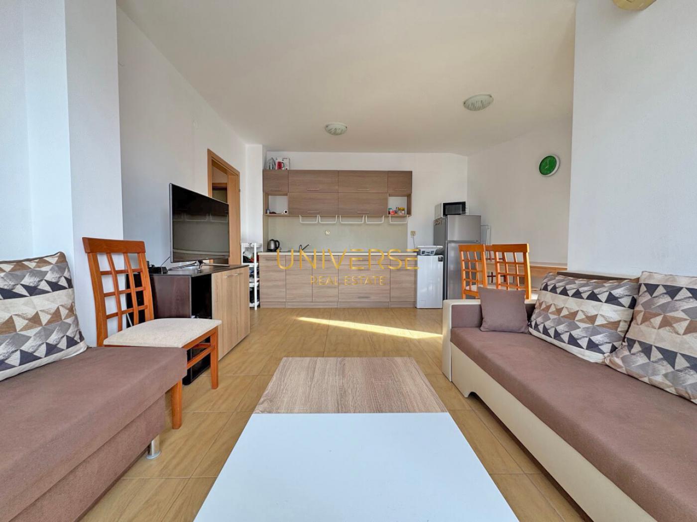 A 1+1 apartment in a well-maintained complex in Sveti Vlas is for sale. It is furnished and equipped with all necessary appliances. The complex features two large swimming pools for adults and a separate children's pool, spacious, well-maintained grounds, a pool bar, a restaurant, a children's playground, a grocery store, 24-hour security, parking spaces, and year-round maintenance of common areas and grounds. Top location – close to all year-round amenities, the sea, and the mountains. Act 16 #5585