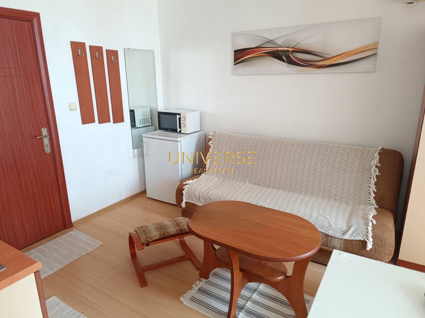 Представляем к продаже студию в круглогодичном комплексе на Солнечном Берегу. Из мебели остается кухня и гардероб. В комплексе работает бассейн, оборудованы места отдыха. Выгодная инвестиция для сдачи в аренду. Бытовые тарифы. Низкая Такса поддержки-35евро/год. Рядом с комплексом расположена вся необходимая инфраструктура для комфортного проживания. Акт.16.#5454