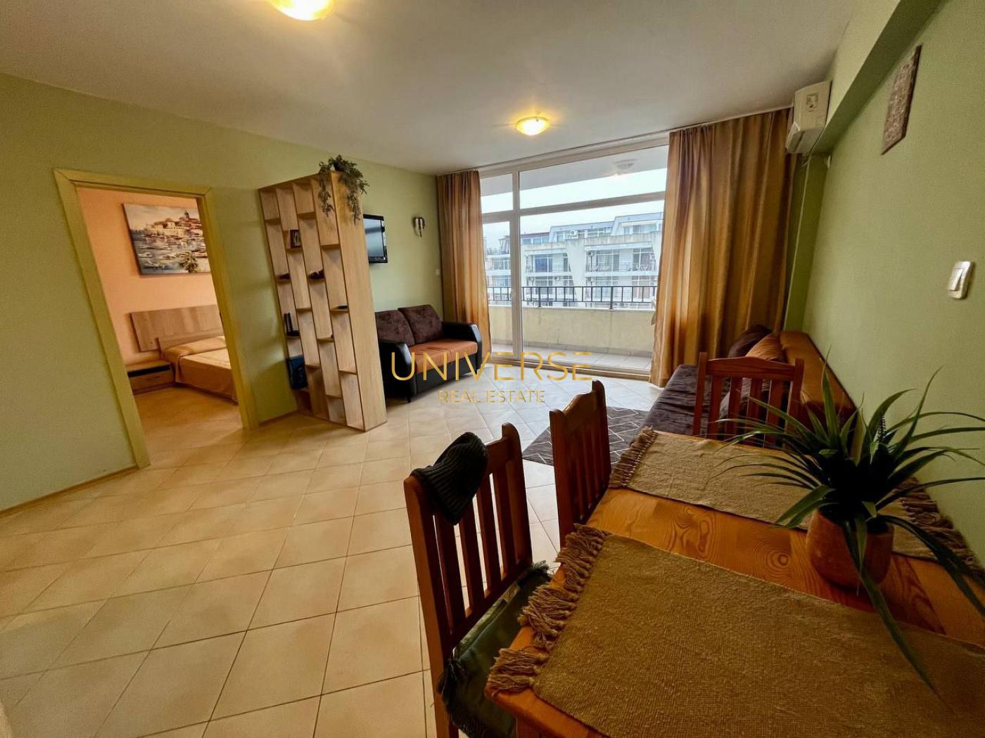 Предлагаем к продаже шикарный апартамент с двумя спальнями на Солнечном Берегу. Планировка: гостиная с кухонной зоной,2 спальни, прихожая, санузел с душевой и терраса. Есть вся необходимая мебель и техника. Престижный комплекс с большим бассейном, зонами для отдыха и шезлонгами. На территории есть детская площадка, спортивная зона и красивая зелёная территория. Песчаный пляж находится на расстоянии 500 м. В пешей доступности ст. г. Несебър. (культурное наследие ЮНЕСКО) Акт 16.#5510